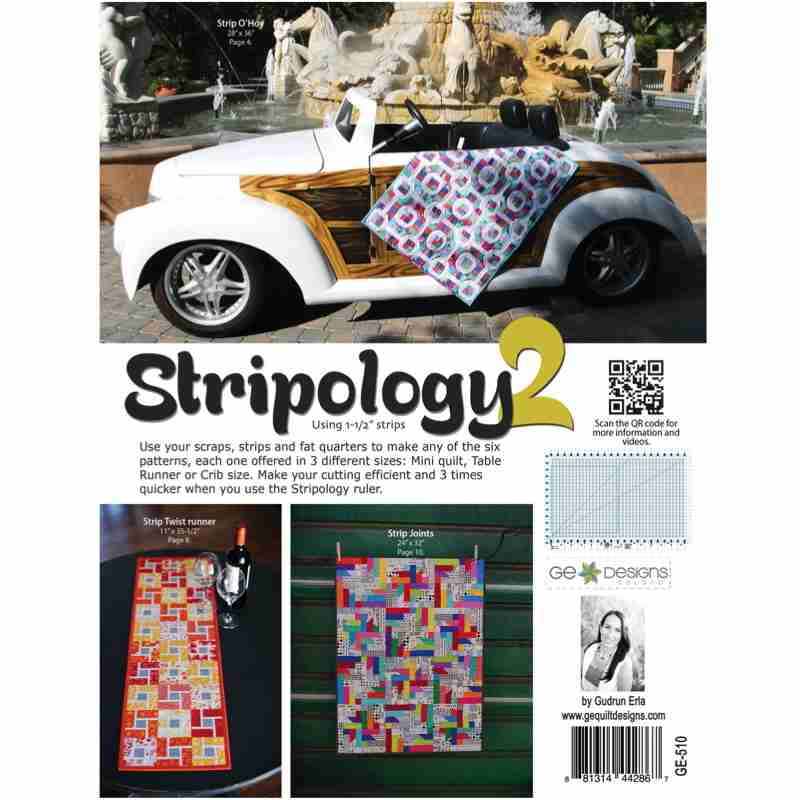 Stripology 2 – Quilt Pattern Book by Gudrun Erla, GE Designs Use your scraps, strips and fat quarters to make any of 6 new patterns, each one offered in 3 different sizes: Mini quilt, Table Runner or Crib size. Make your cutting efficient and 3 times quicker when you use the Stripology ruler (available separately in my store). Use the Stripology...