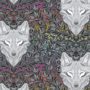 A textile design featuring a repeated pattern of a wolf's face with surrounding abstract floral elements, predominantly in gray shades with highlights of pink, orange, and yellow.